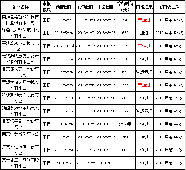 2018年3月份,发审委共召开5次会议审议12家企业IPO申报,均为主板企业,其中7家通过,3家未通过,2家暂缓表决。具体情况如下表: