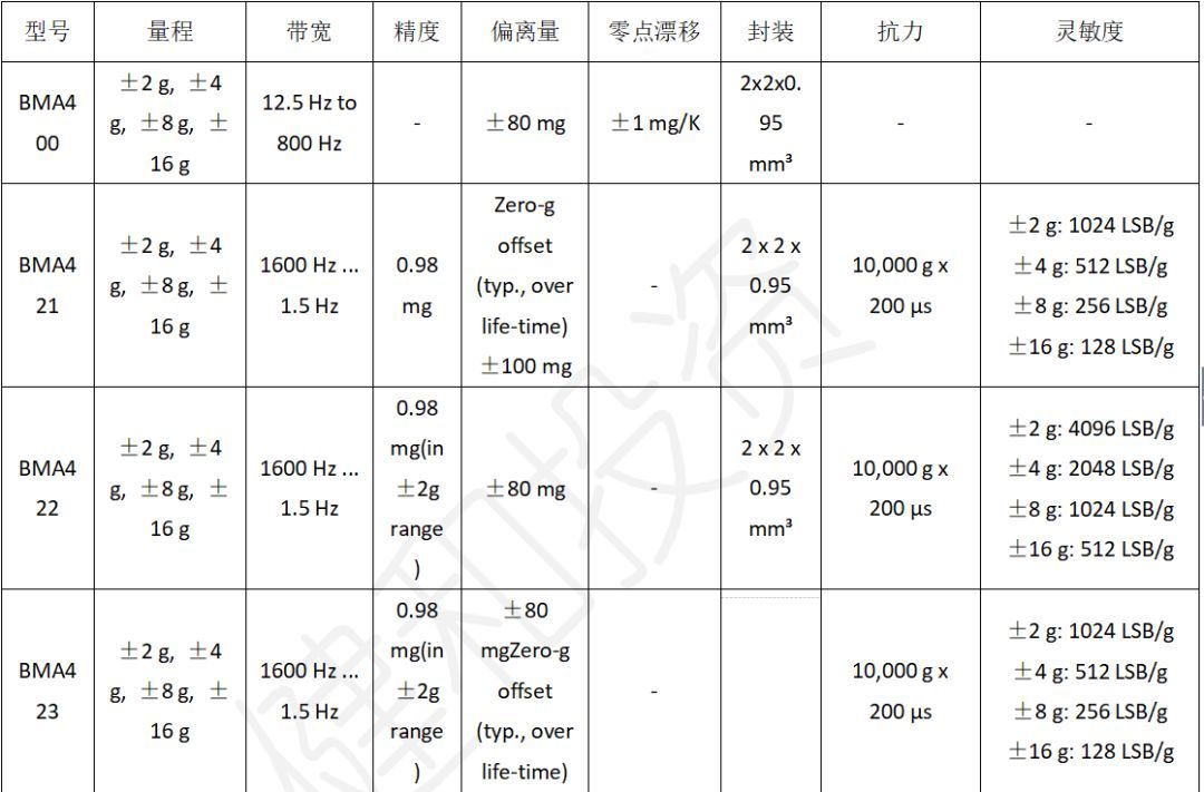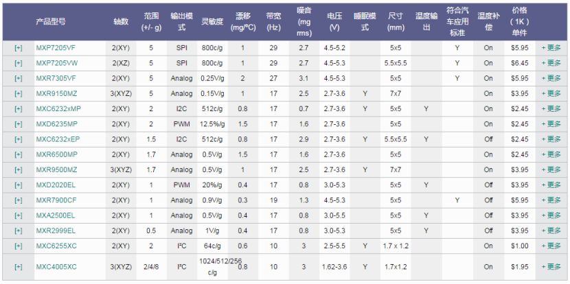 在汽车电子领域,美新半导体与博世半导体的MEMS加速度计传感器技术差距较大,博世传感器的量程最高达±16 g,带宽达到1600hz,而美新最大量程则只有±8 g,最大带宽29hz;应用于3C市场的MEMS加速度计传感器,两者在带宽和量程上的差距不大,这是因为3C数码的MEMS加速度传感器技术要求相对较低。最后从封装的角度来看,美新半导体与博世的差距非常明显,博世普遍能够做到2*2,而美新半导体普遍为5*5,美新封装高度暂时未知。