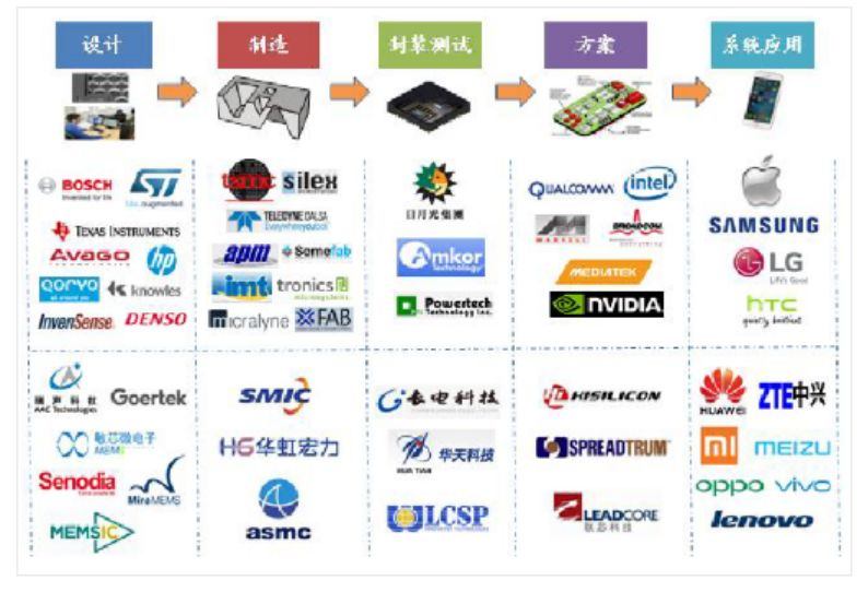 MEMS传感器整个产业链非常复杂,涉及众多厂商,下图列举了产业链上具有代表性的厂商。