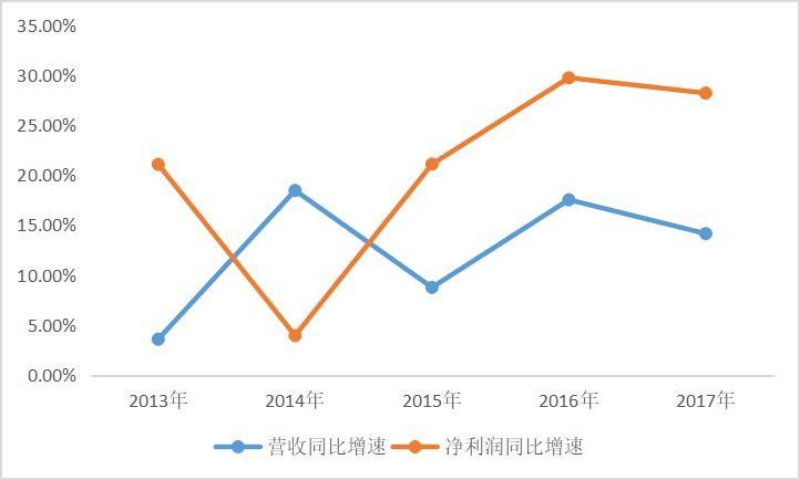 2017年森霸传感营收同比增长14.14%,净利润同比增长28.20%。2013-2017年营收CAGR为14.5%,净利润CAGR为20.2%。过去五年的成长性较好。