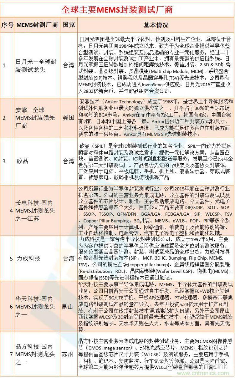 目前具备MEMS封装测试能力的国际厂商主要有日月光、力成科技等,国内有华天科技、长电科技等厂商。国内在MEMS传感器封装测试领域表现较好,有一定竞争力。这是因为国内的封装技术起步较早,国内MEMS产业链后端封装较为完善。