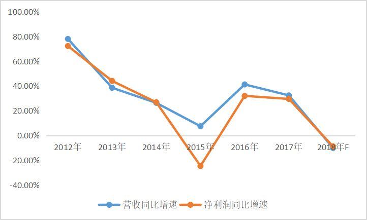歌尔股份从2012-2017年成长性良好,营收CAGR(年均复合增长率)为28.63%,净利润CAGR为18.67%。由于苹果取消订单,2018年一季度净利润同比下降近40%,预计全年营收下降10%,净利润下降8.7%。