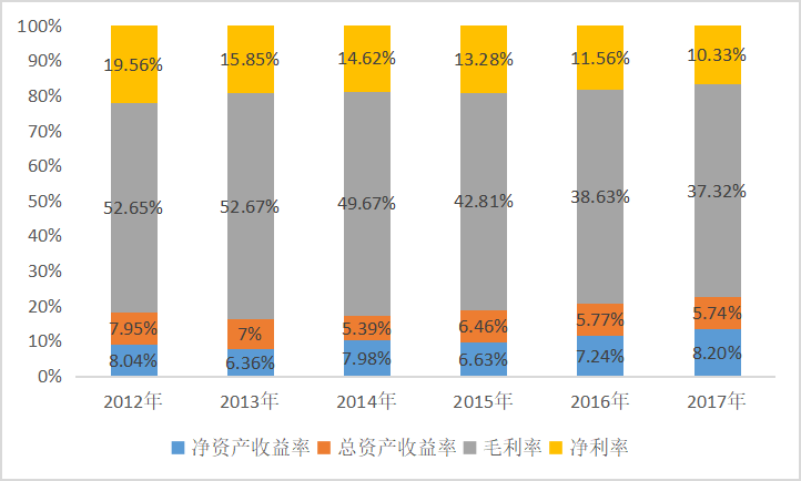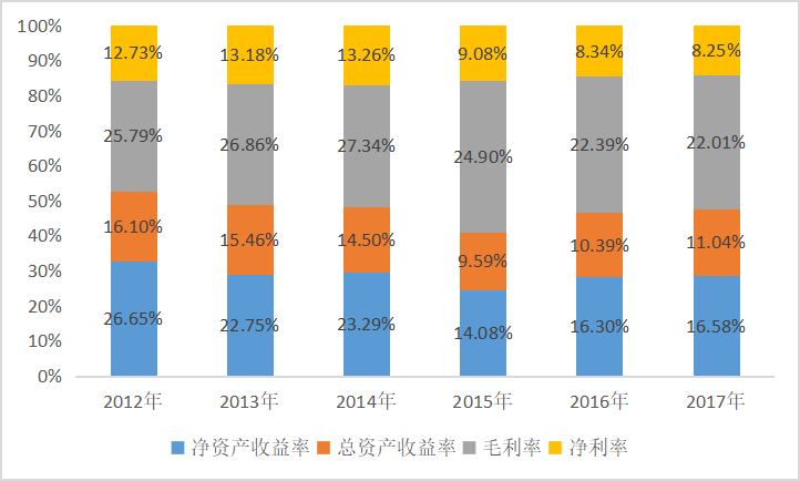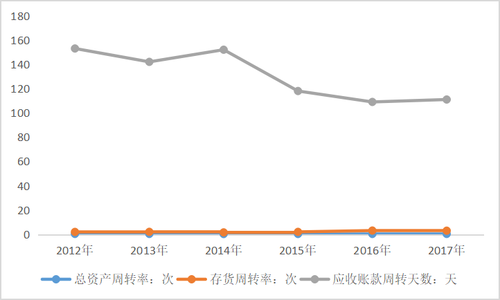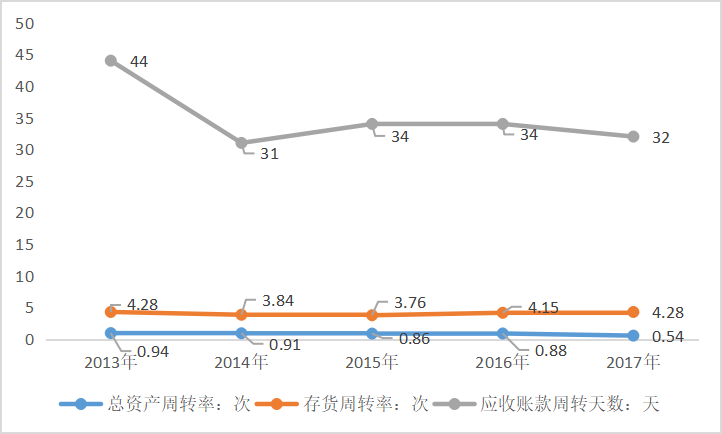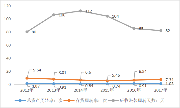 应收账款周转天数在2014年达到最高112天,2017年则将为82天;存货周转率在5.46-9.54之间;总资产周转率在0.74-1.03之间,2017年则达到了1.03,显示企业较好的运营能力。综合来看,从2015到2017年企业的运营能力是逐步增强的,这可能与宏观经济的变化有关,也可能是由于企业精简了组织结构,增强了管理效率。