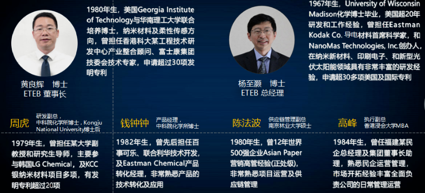 创始人黄良辉先生为美国佐治亚理工学院与华南理工大学联合培养博士、曾任某大学副教授,联合创始人杨至灏博士为"千人计划"特聘专家,是国际上公认在该行业的技术奠基人之一。目前启明光大团队成员共40人,其中海归博士4人,硕士6人,50%以上为研发人员,已经形成了以黄博士、杨博士为核心,凝聚了一批印刷电子和柔性电子印刷行业的领军人物的稳定团队。