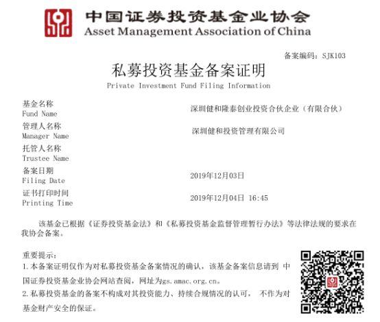 潮平两岸阔,风正一帆悬。近日,深圳健和投资管理有限公司(以下简称“健和投资”)旗下第六只私募股权类投资基金——深圳健和隆泰创业投资合伙企业(有限合伙)(以下简称“隆泰基金”)成功发行并在中国证券投资基金业协会顺利完成备案,备案编码为SJK103。隆泰基金由健和投资山东办公室负责人曹玉松先生主导,健和投资担任普通合伙人兼基金管理人,基金规模共计3900万元。隆泰基金已联合红塔创投等众多知名投资机构完成对“烟台万隆真空冶金股份有限公司”的投资。