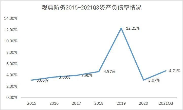 3、从资产情况来看,观典防务经营管理极为稳健,现金流十分充沛。除2019年资产负债率略有上升以外,其他年份资产负债率都保持在5%以下的极低水平。而截止2021年第三季度,公司账上货币资金近4亿元,充分显示了公司良好的财务情况,也为公司未来的扩张和加速增长提供了坚实基础。