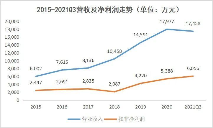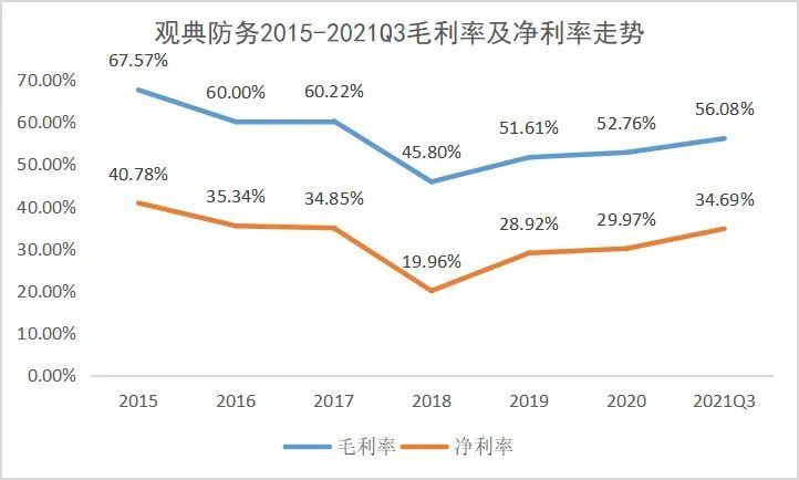 观典防务自2015年于新三板挂牌以来,观典防务财务数据表现极为亮眼,营业收入从6000余万增长至2020年的1.8亿元,年化平均增速24.5%,扣非净利润从2400余万增长至近5400万,年化平均增速17%。根据最新披露的财报,2021年前三季度观典防务已分别实现营收1.75亿元,扣非净利润6000余万,前三季度的收入已接近2020年的水平,而净利润已远远超出2020年全年水平。预计公司2021年营收和净利润将分别实现增长20%、25%左右,仍将保持较快的增速。