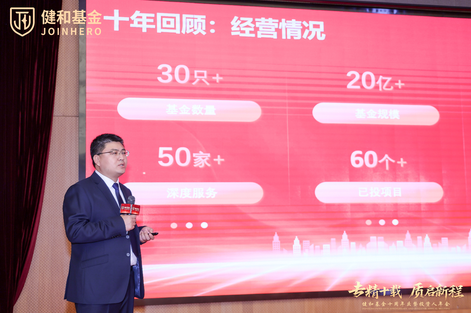 会议最后,健和基金董事长张铭先生上台致辞,回顾了过去十年的经营情况,分享了对当前市场环境的深刻洞察及未来投资方向的展望。张铭董事长表示,健和基金未来将继续坚持“专、精、特、新、稳”的经营方针,围绕国家战略新兴产业方向,深耕先进制造领域,聚焦产业基金,以产业化投资为基础,以投资价值实现为目标,助力产业升级与投资人收益增长。