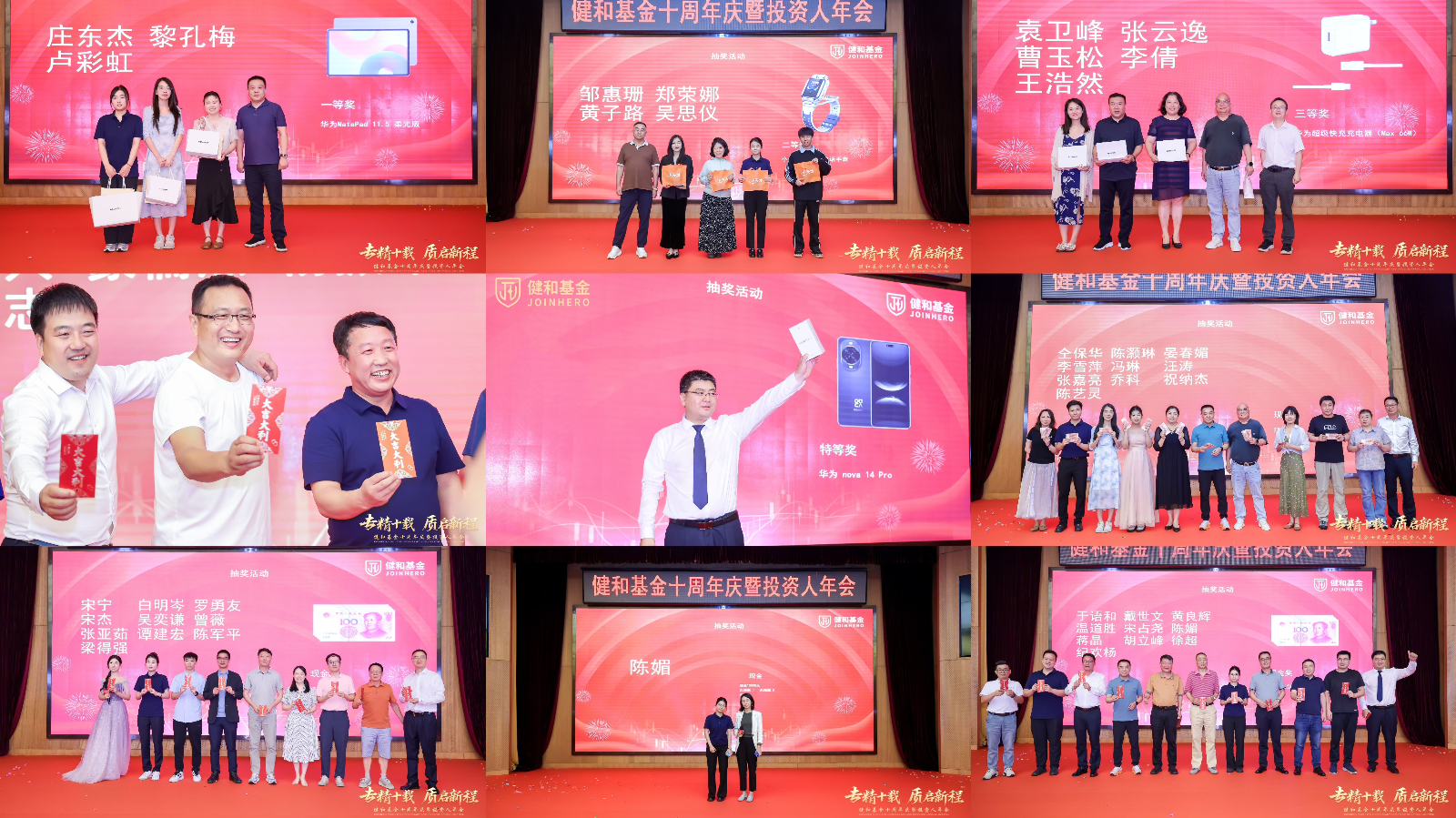 晚宴的抽奖环节更是将现场氛围推向欢乐巅峰:华为手机、平板电脑、智能手表等实用好礼琳琅满目,健和基金高管与合伙人加码赞助的现金红包掀起阵阵热潮。觥筹交错间,碰杯声与欢笑声共鸣,掌声如浪潮迭起,共同定格这场镌刻着信任与荣耀的十周年盛会。