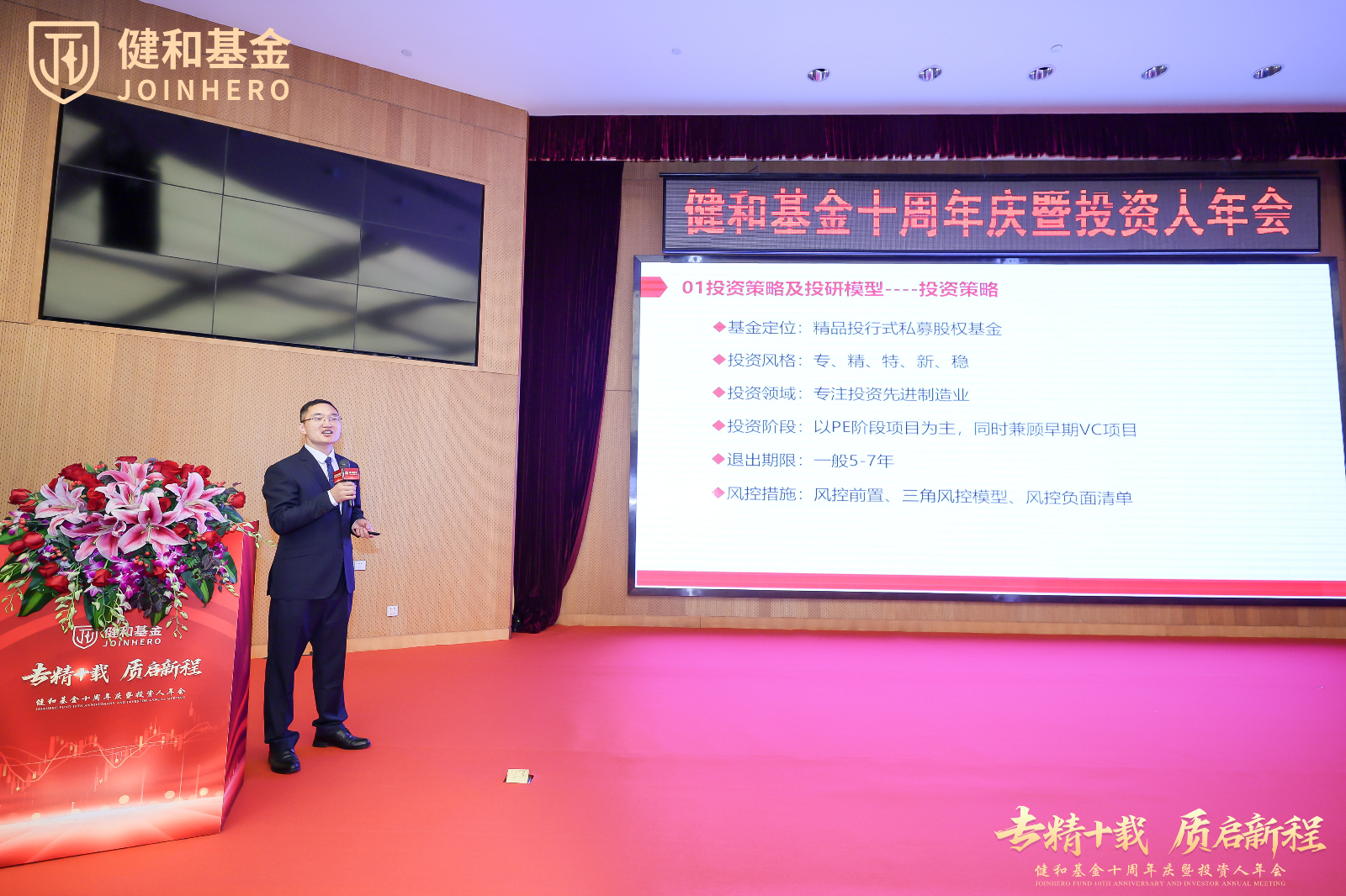 会议伊始,健和基金副董事长赖承勇先生作投资研究汇报,赖承勇先生详细介绍了健和基金独创的“Σ投研模型”,并对过去十年的投资业绩进行了回顾与分析。过去十年,健和基金在先进制造业领域积极布局,投成宏工、致宏、震有科技等多个爆款项目,股权项目退出比例达46.35%、新三板IPO成功率达50%、不良项目规模占比低于2%。