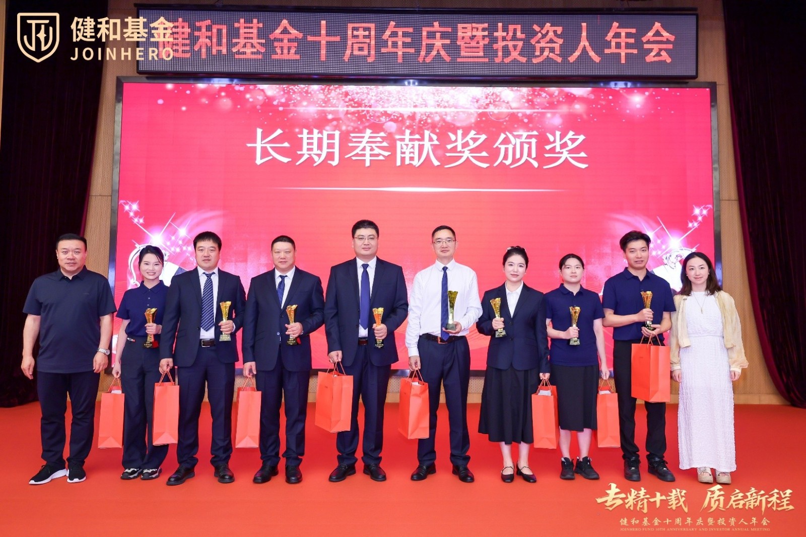 紧接着,会议进入表彰环节,张雄先生、陆刚先生、罗金香女士、王国栋先生、深圳长宏融通有限公司代表黄河先生五位投资人荣获“长青投资人奖”,这个奖项表彰了他们以长期主义与持续注资,陪伴健和基金实现从 0 到 20 亿管理规模的跨越。投资人的信任是我们前行的动力,同样重要的,还有一路并肩作战的战友,“长期奉献奖”授予程香女士、李家玲女士、陈云女士等八位核心成员,致敬他们在初创攻坚期与市场波动中,以专业坚守托举健和发展的岁月。
